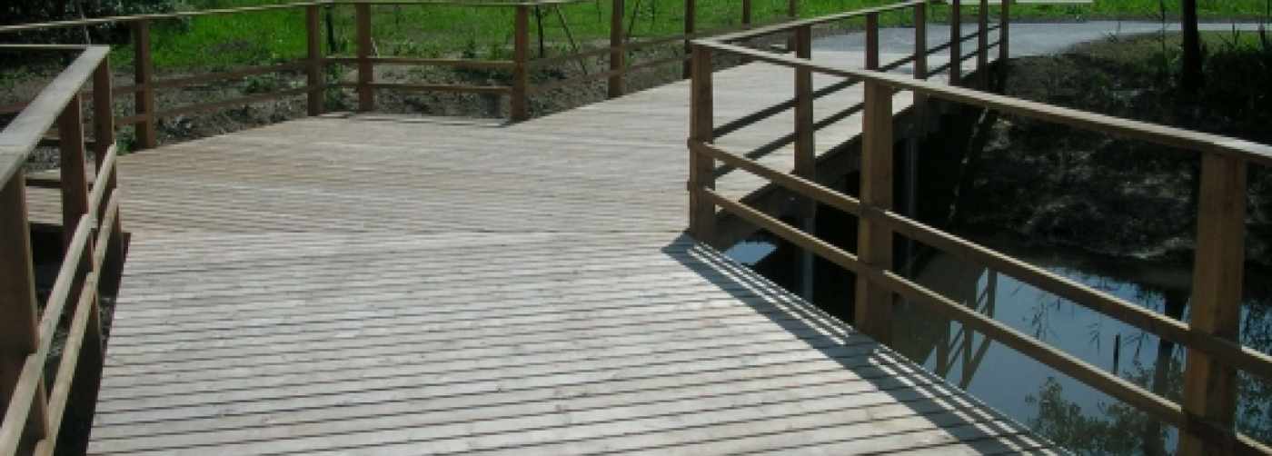 Holzbrücke mit Stahlunterkostruktion am Jakobsweg in Hurden. Das Bauwerk wurde in Zusammenarbeit mit einem Landschaftsarchitekten geplant und realisiert.