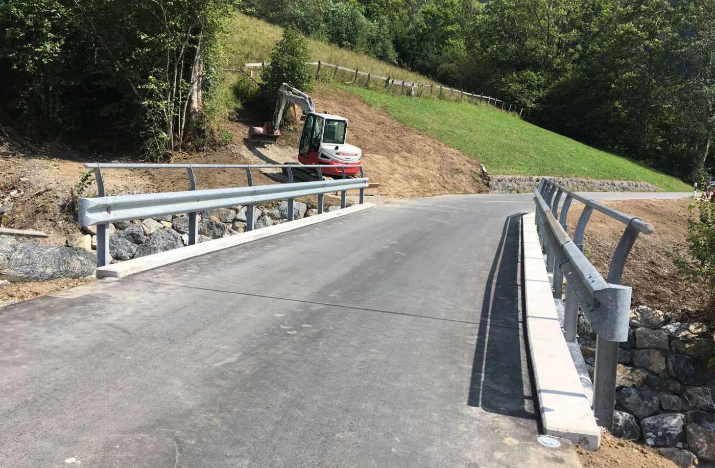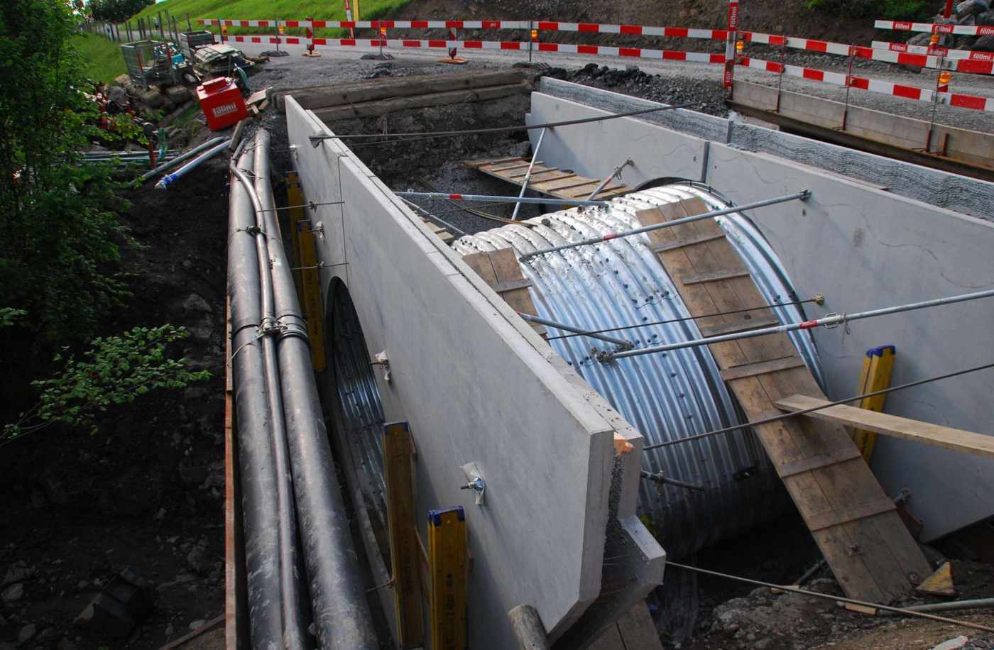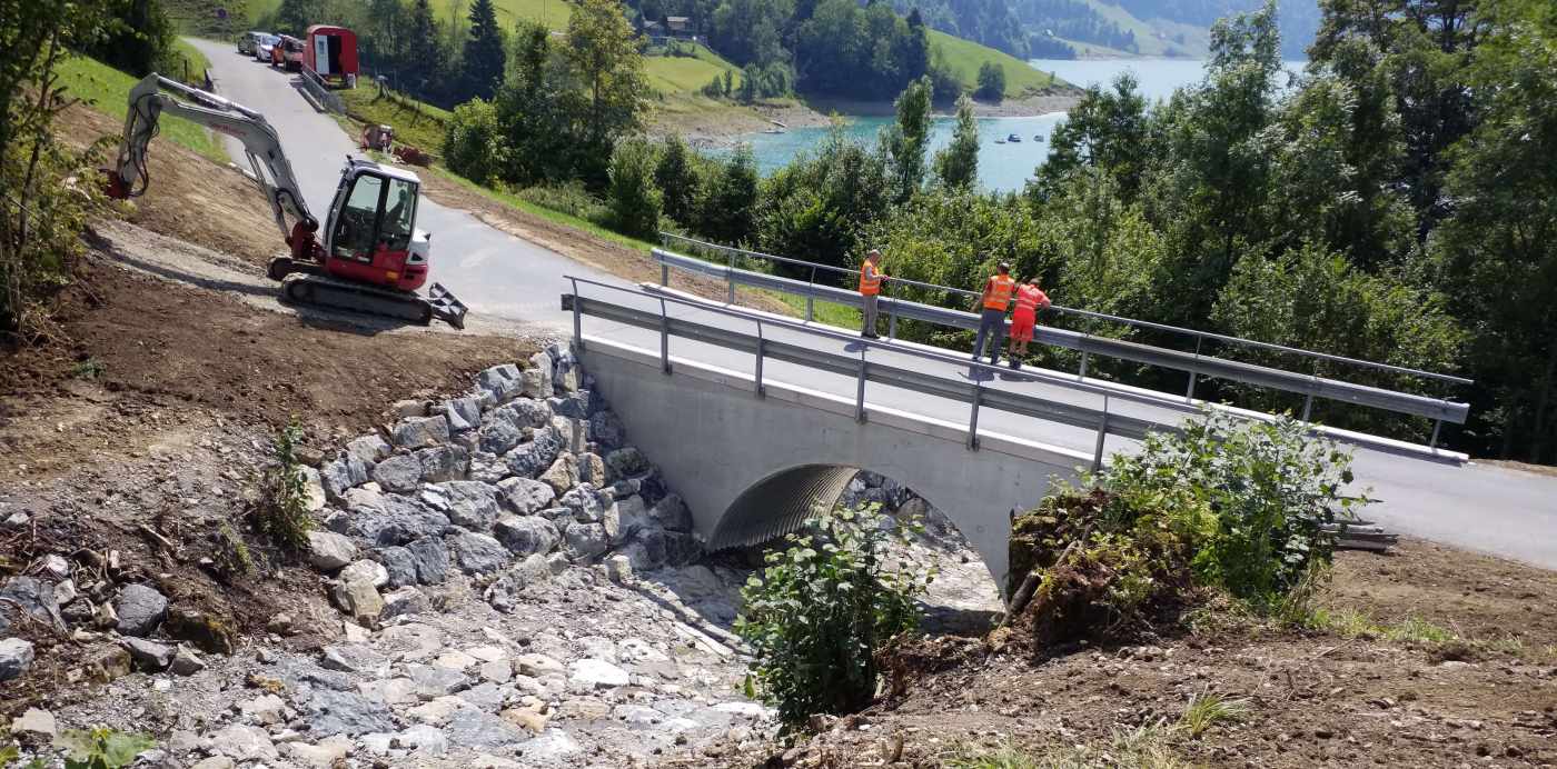 Die Beckibachbrücke wurde im Jahr 1923/1924 erstellt und erstmals im Jahre 1996 saniert. Sie war in einem sehr schlechten Zustand und musste ersetzt werden. Die bestehende Betonbrücke wurde vollständig abgebrochen und durch einen Wellstahldurchlass mit seitlichen Betonflügelmauern ersetzt. Der Durchlass wurde mit einem Gefälle von 18 % ausgeführt. Die Bemessungen des Durchlasses erfolgten aufgrund möglicher Murgänge. Die Bachsohle wurde im Brückenbereich abgesenkt, was zu einer geringeren Verklausungsgefahr führt. Das Wellstahlrohr weisst ein Maulprofil mit einer Breite von 6.04 m und einer Höhe von 3.62 m auf. Die Flügelmauern wurden mit Elsässerelementen erstellt. Oberhalb und unterhalb des Durchlasses wurden die Bachsohle sowie die Uferbereiche mit in Beton versetzten Blöcken stabilisiert.