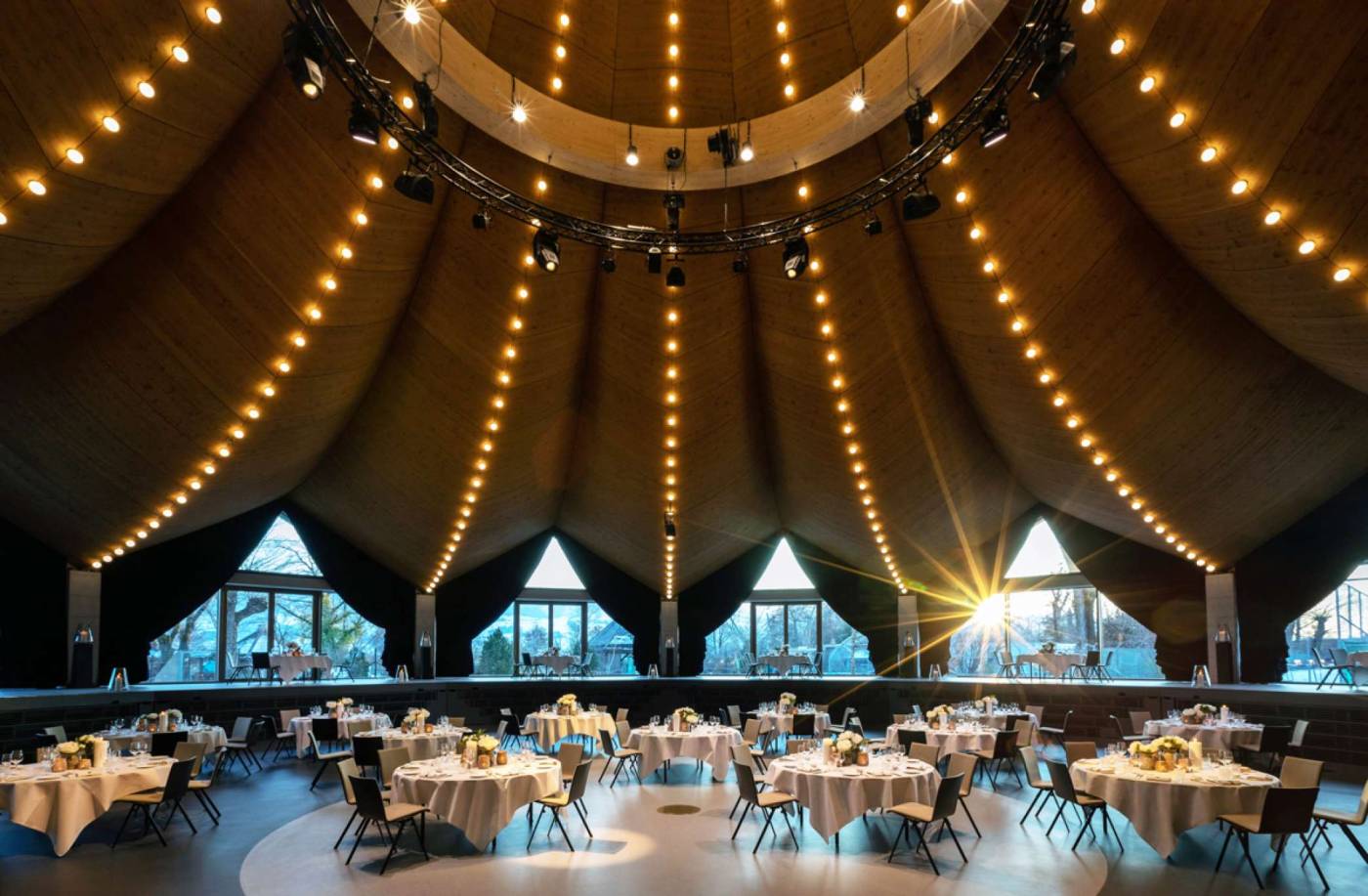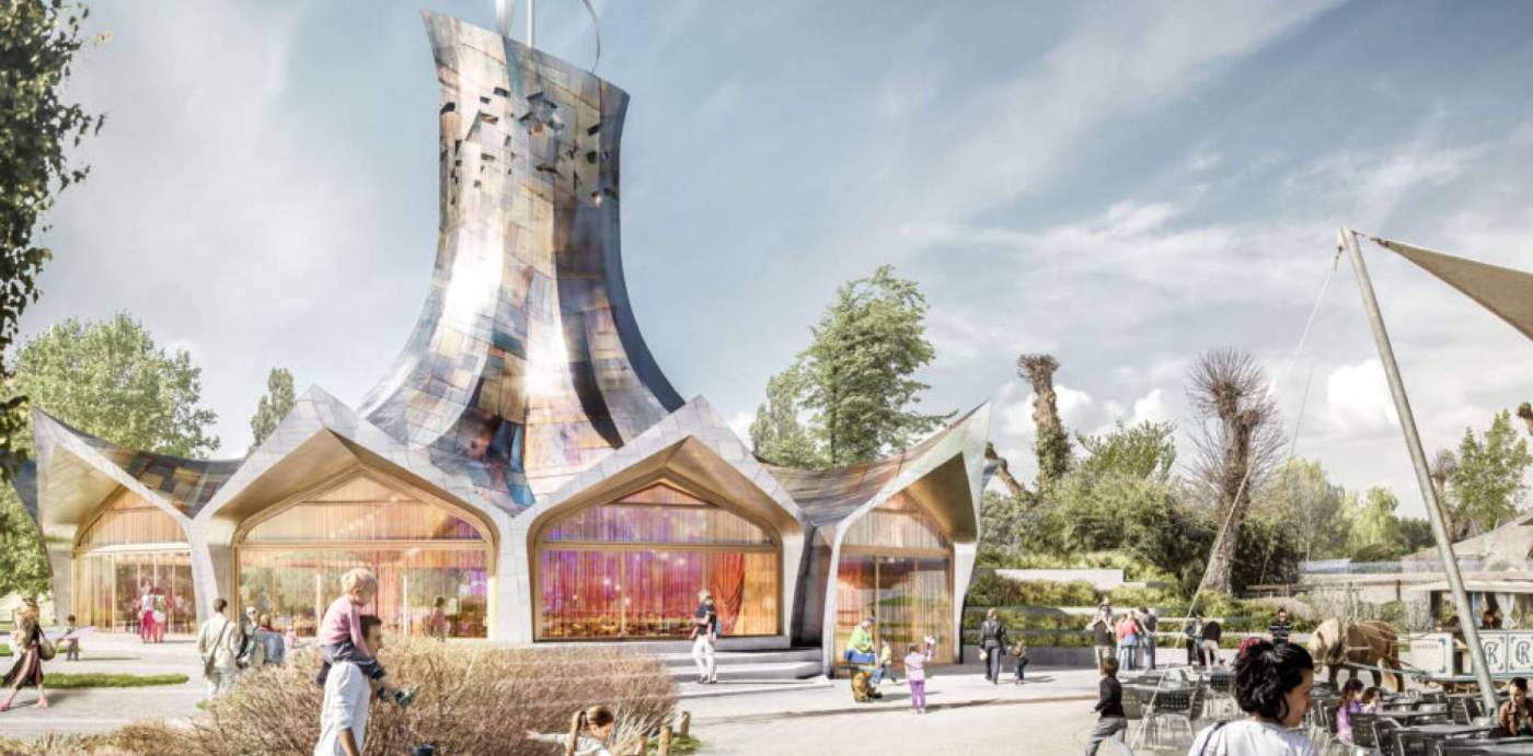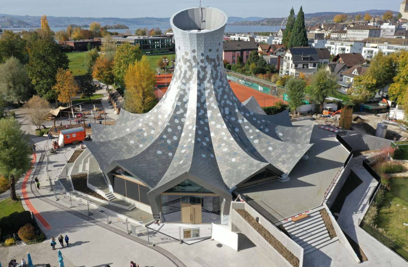 Das rund 25m hohe Gebäude steht im Herzen des zoologischen Gartens der Gebrüder Knie, in Rapperswil. Das freitragende Zeltdach in Holzbauweise ist als Schalenfaltwerk konzipiert. Ein Ring aus schlaff bewehrtem Stahlbeton leitet die Horizontalkräfte in die vor Ort vorfabrizierten Sichtbetonstützen ein. Das Sockelgeschoss in Massivbauweise steht auf Grund der Nähe zum See auf einer Pfahlgründung.