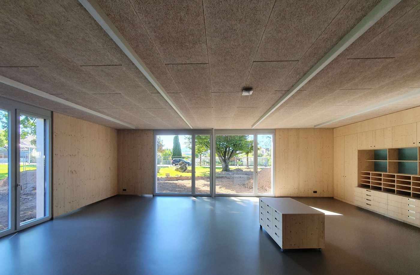 Beim Neubau handelt es sich um einen zweiteiligen, eingeschossigen Kindergarten in Holzelementbauweise. Die Fundation besteht aus einer flachfundierten Bodenplatte.