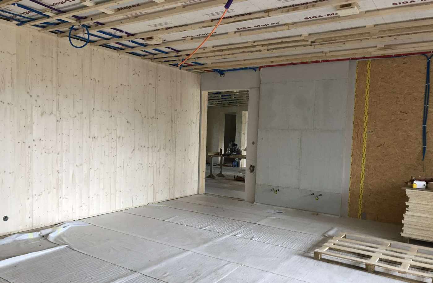 Die Deckenkonstruktion wurde mit Hohlkastenelementen ausgeführt. Diese liegen wiederum auf Stahlträgern und den tragenden Holzelementwänden auf.