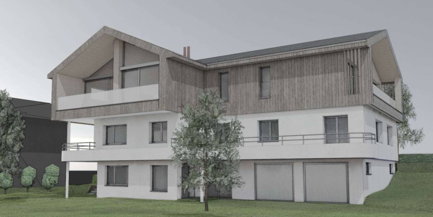 Das bestehende Einfamilienhaus wurde durch eine grosszügige Aufstockung mit einer zusätzlichen Wohnung erweitert. Diese wurde in Holzbauweise realisiert