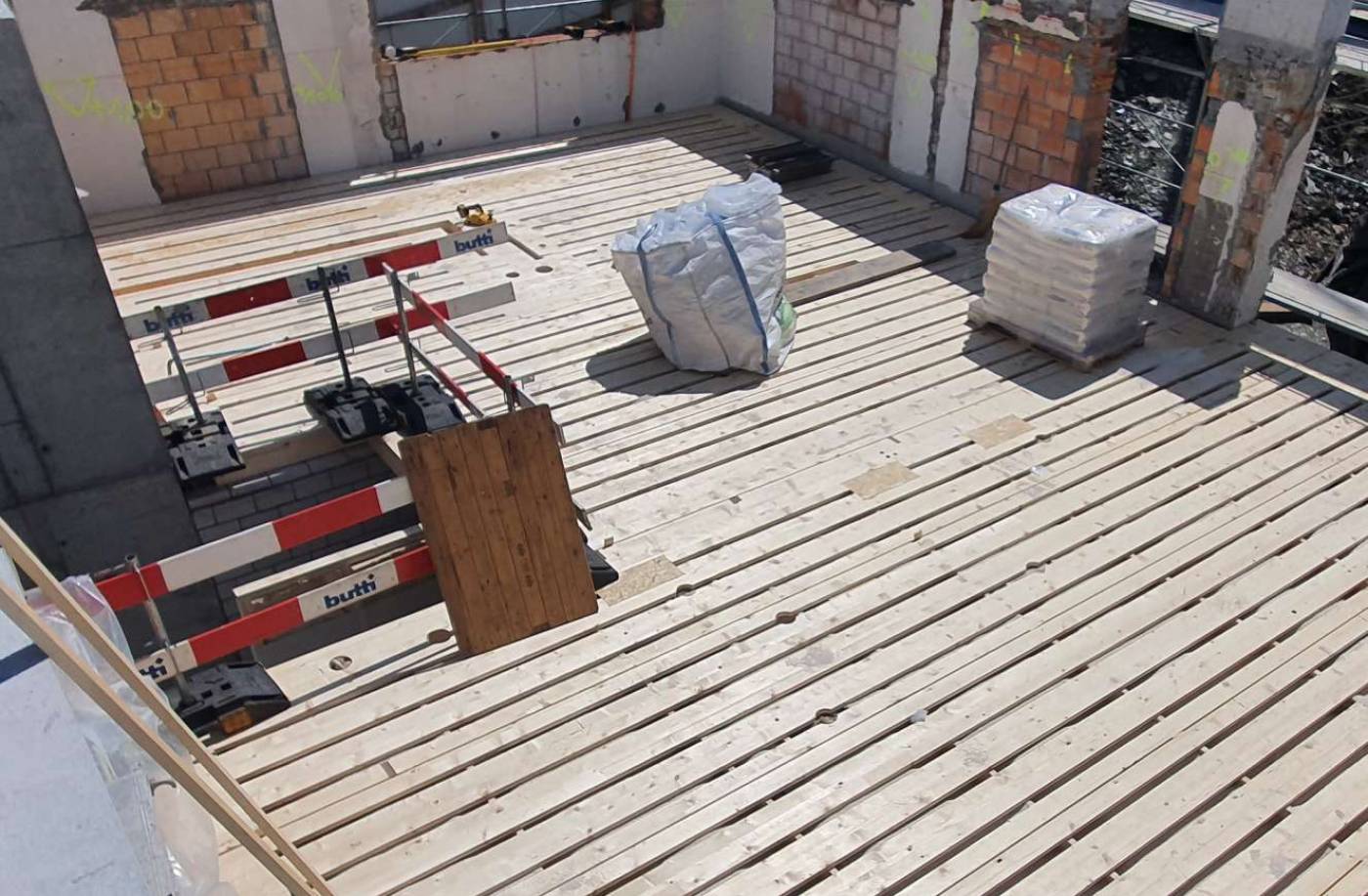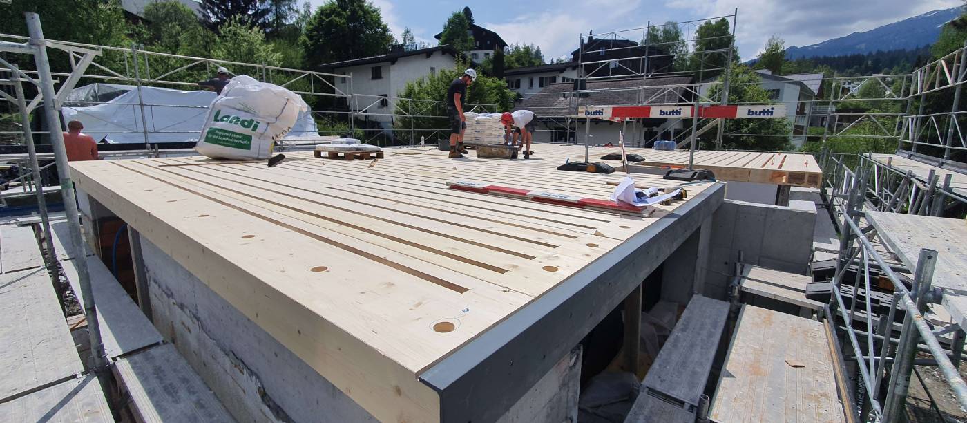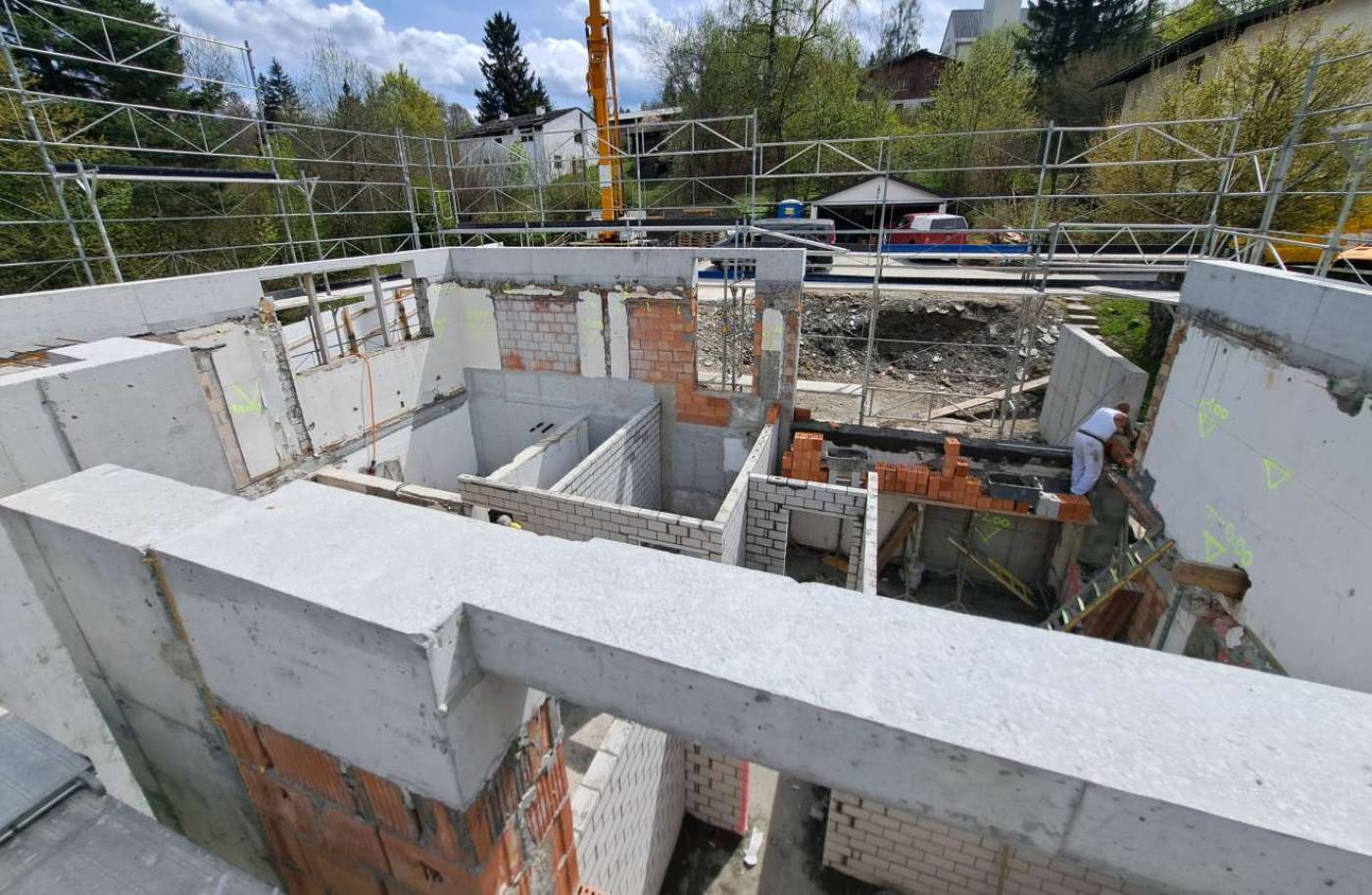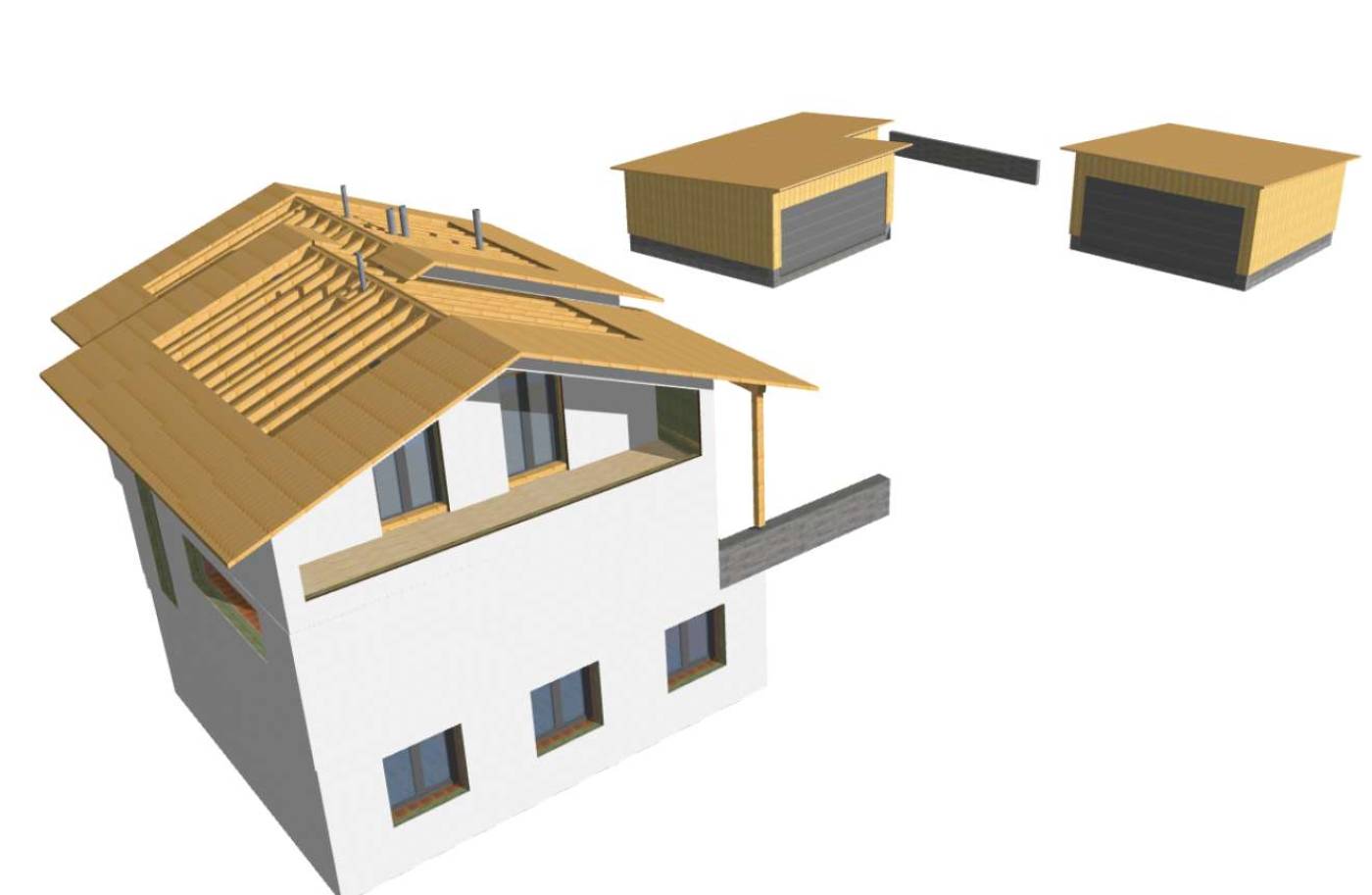 Das Dach und Obergeschoss werden abgebrochen und neu durch einen Holzbau geplant. Des Weiteren sind zwei neue Garagen geplant. Das Kellergeschoss bleibt dabei bestehen, wobei die Innenwände und Decke ebenfalls teilweise mit einem neuen Holzbau erstellt werden. Bei den bestehenden Grundmauern handelt es sich um eine Natursteinmauer. Dies wurde mit einem neuen Betonkranz gesichert und an den neuen aussteifenden Holzbau angebunden. Der Holzbau wurde in einer Rahmenbauweise konzipiert und umgesetzt.
