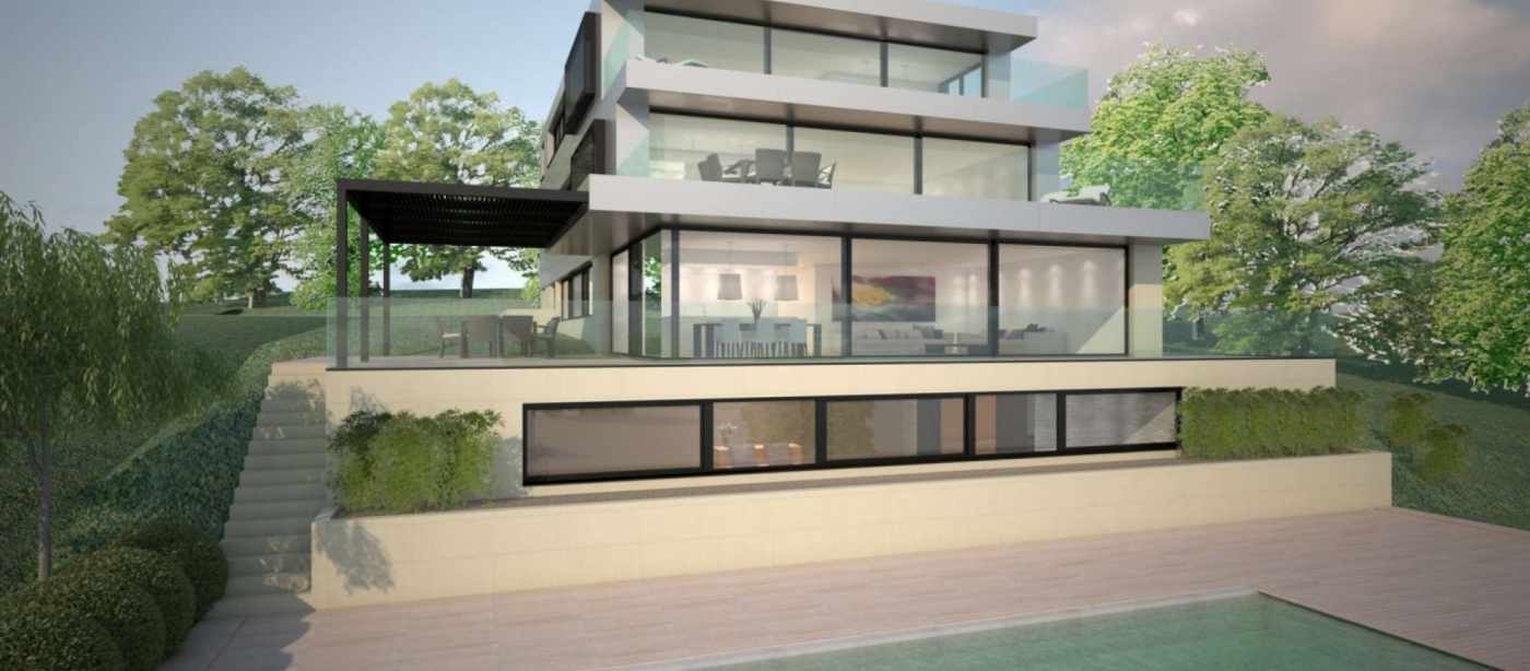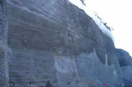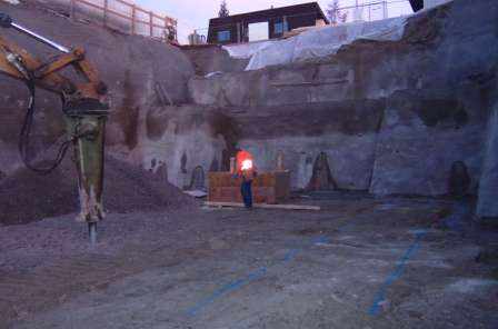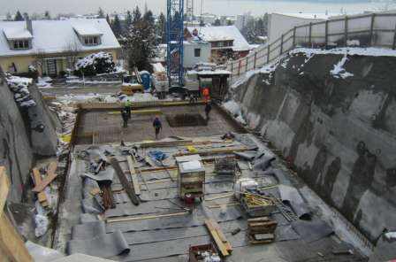 Die Baugrube reichte nördlich bis zu neun Meter tief in den Hang. Der Aushub musste grösstenteils in den bröckeligen, instabilen Mergelfels gespitzt werden. Als Sicherung wurden im nördlichen, östlichen und westlichen Teil eine netzbewehrteSpritzbetonwand sowie ungespannte Felsnägel verwendet. Die auf der steilen Felsoberfläche liegende Deckschicht wurde bis ca. 2m Höhe frei geböscht.