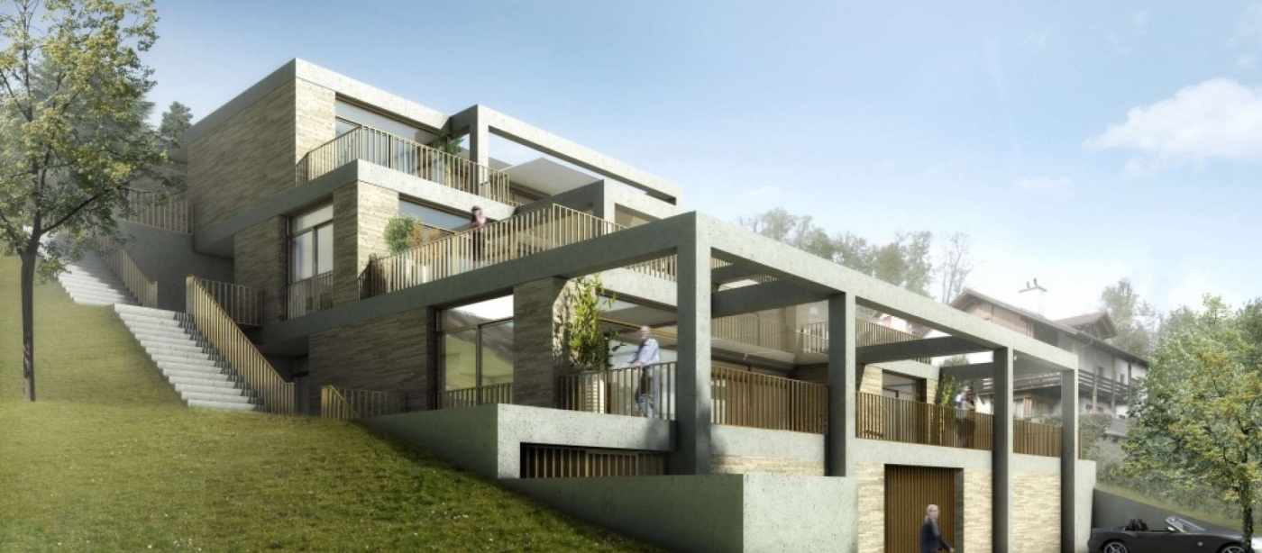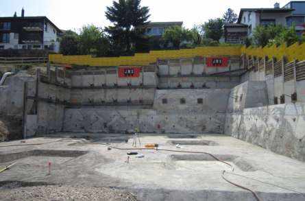 Beim vorliegenden Bauobjekt handelt es sich um ein Terrassenhaus in Massivbauweise, best. aus einer Einstellhalle in der Ebene 00 und drei Wohngeschossen in den Ebenen 01 bis 03. Die Grundrissabmessung der Ebene 00 (Einstellhalle) beträgt zirka 22 m x 24 m. Die Grundrissabmessungen der Ebenen 01 und 02 betragen zirka 20 m x 22 m und diejenige der Ebene 03 zirka 10m x 18 m. Die horizontalen Tragelemente bestehen aus schlaff bewehrten Stahlbetondecken, die vertikalen Tragelemente aus Stahlbeton- &Mauerwerkswänden sowie vorfabr. Stahlbeton- &Stahlstützen. Das Bauwerk wird als Wohnhaus genutzt. Baugrube: Infolge der engen Platzverhältnisse musste die Baugrube mittels rückverankerter Rühlwand gesichert werden. Die Gebäudelasten wurden konsequent, wo nötig, mittels Geröllbetonriegel, in die Moräne abgeleitet.