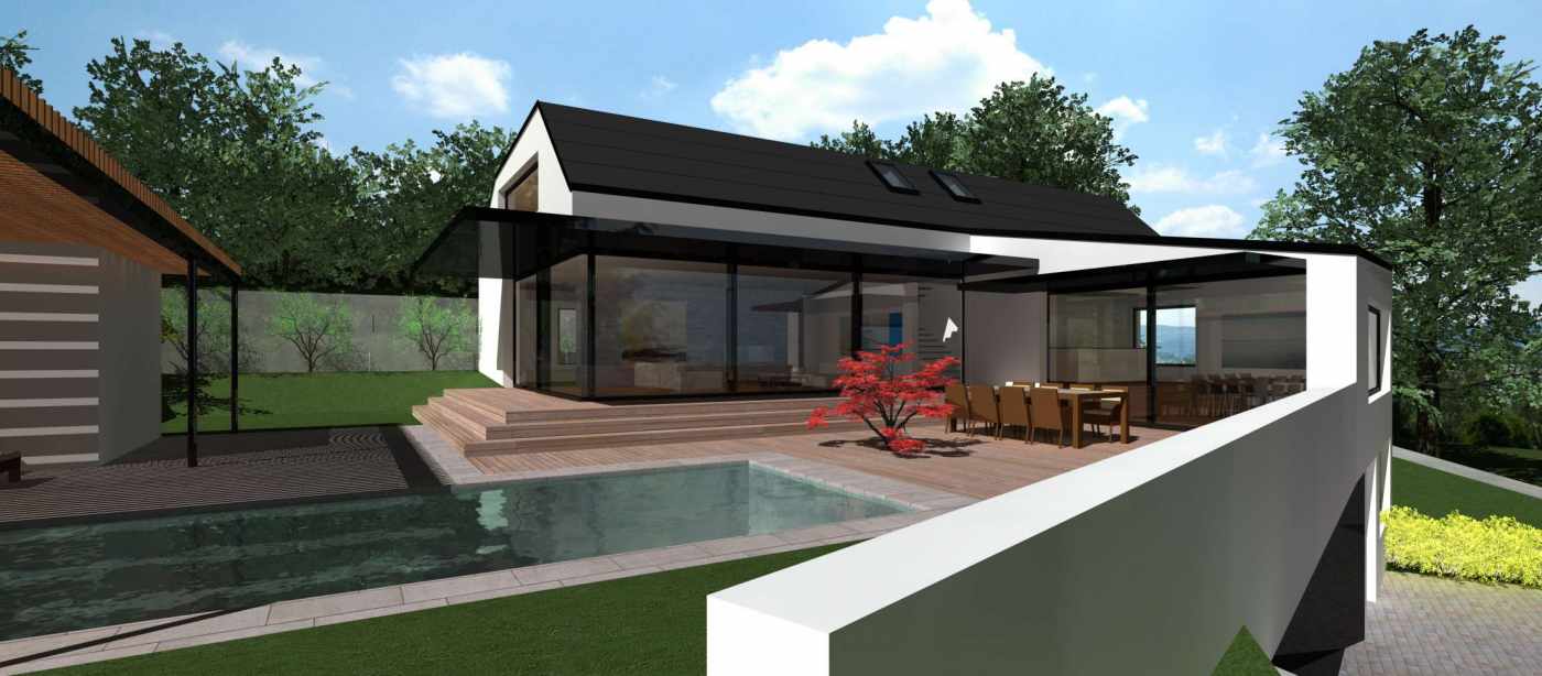 Bei dem Neubau handelt es sich um ein Einfamilienhaus in Massivbau bestehend aus einem Untergeschoss, einem Erdgeschoss sowie einem Obergeschoss mit Schrägdach aus Beton. Die Grundrissabmessungen im Erdgeschoss betragen zirka 16.5m x 17.5m.