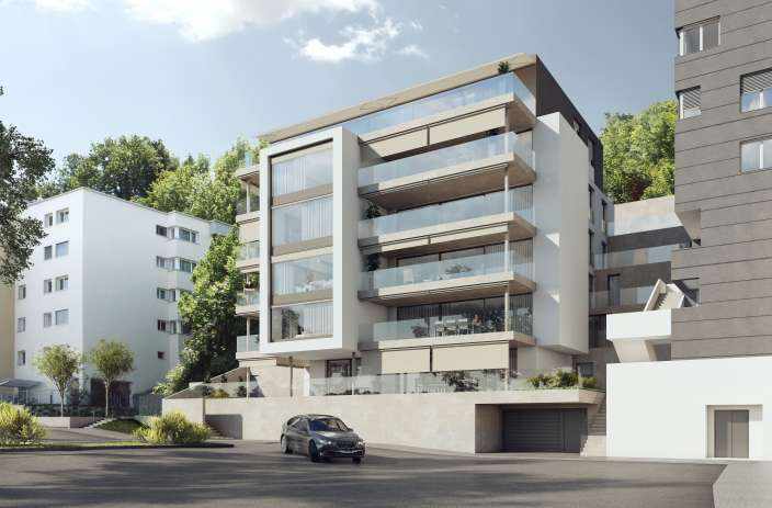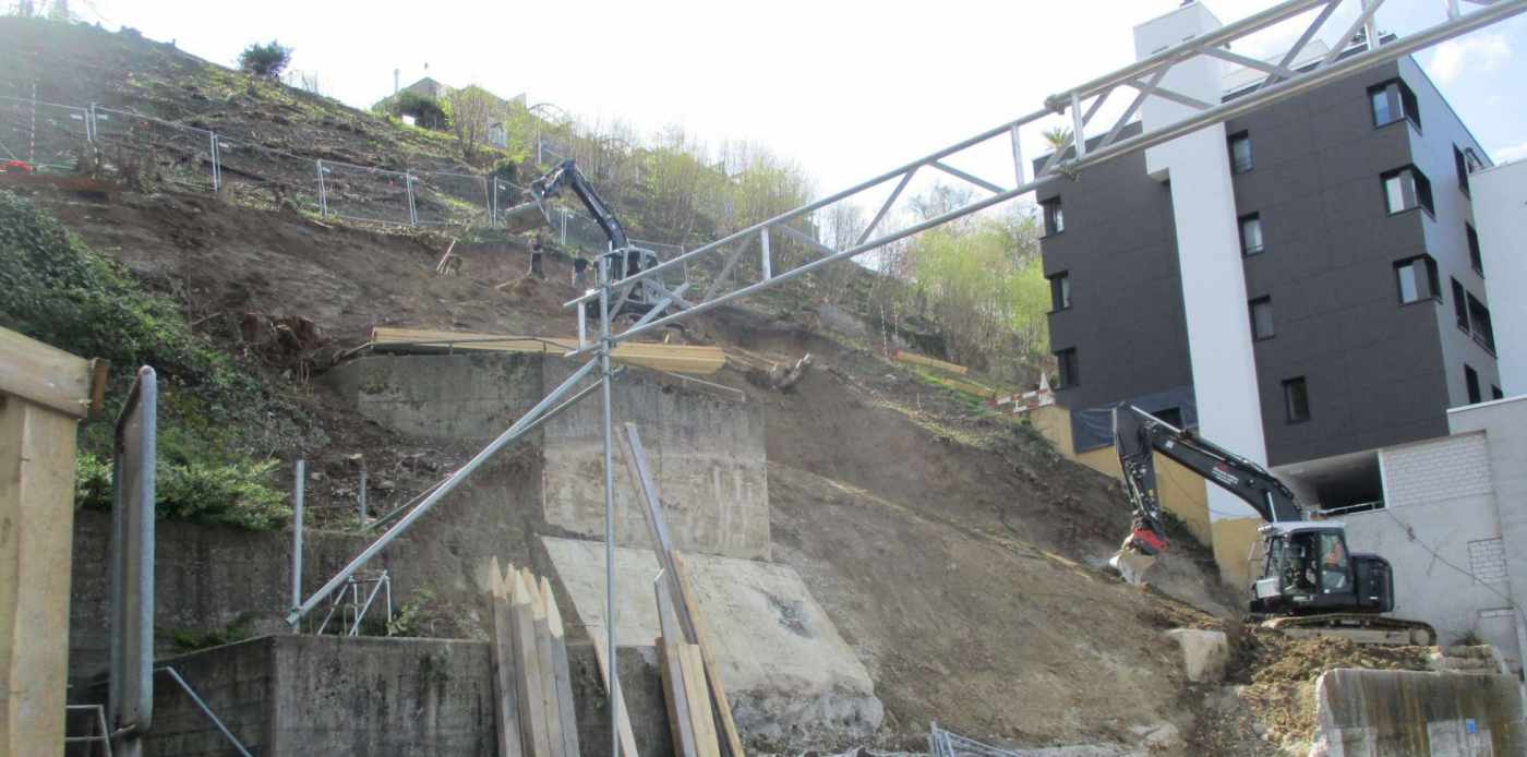 Beim vorliegenden Projekt handelt es sich um ein Mehrfamilienhaus in Massivbauweise, bestehend aus einem Untergeschoss, einem Erdgeschoss, vier Obergeschossen und einem Attikageschoss. Die Grundrissabmessungen betragen zirka 29.8 x 16.5 m. Da das Gebäude über seine gesamte Höhe in den Hang zu liegen kommt, muss dieses dem Erddruck standhalten. Die daraus resultierenden Kräfte werden im Untergeschoss mittels Zug- und Druckpfählen sowie einem massiven Querriegel im den Baugrund geleitet. Während der Bauphase entsteht ein ca. 20 m hoher Baugrubenabschluss, der mit einer Nagelwand und lokal mit einer Rühlwand gesichert wird. Zudem müssen die beiden benachbarten Gebäude teilweise unterfangen werden.