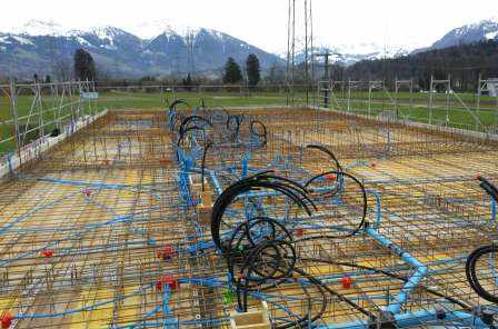 Aus Kostengründen wurde auf ein Untergeschoss verzichtet. Der gut tragfähige Baugrund lag jedoch zwei Meter unter Terrain, die schlechten Bodenschichten wurden mittels Magerbetontatzen überwunden.