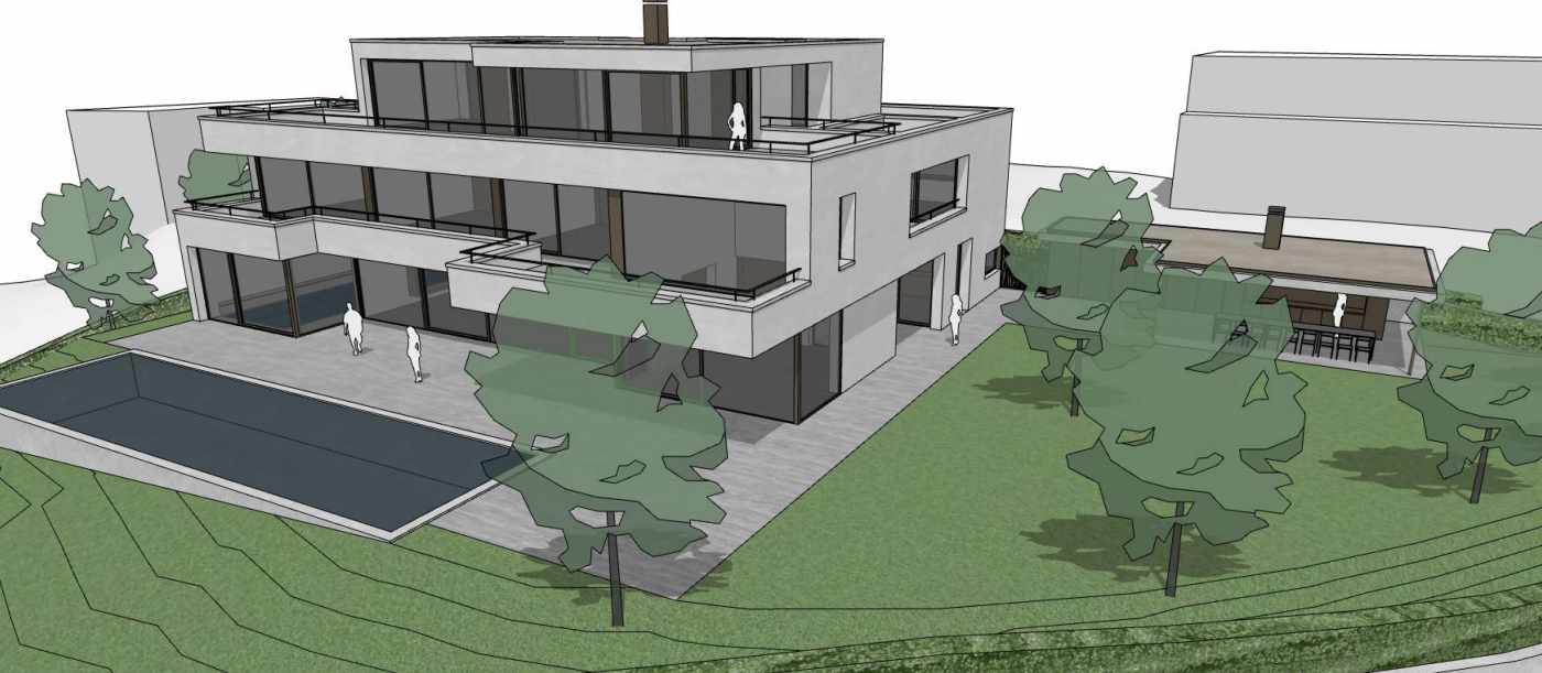 Bei dem Neubau handelt es sich um ein Einfamilienhaus in Massivbauweise, bestehend aus einem Untergeschoss und drei oberirdischen Geschossen mit den approximativen Abmessungen von 19.00 x 24.50 m. Das Hauptgebäude weist im Untergeschoss eine Einstellhalle und einen Squash-Court und im Erdgeschoss einen Innenpool auf. Im Erdgeschoss befindet sich auch ein Aussenpool sowie ein Gartengebäude.