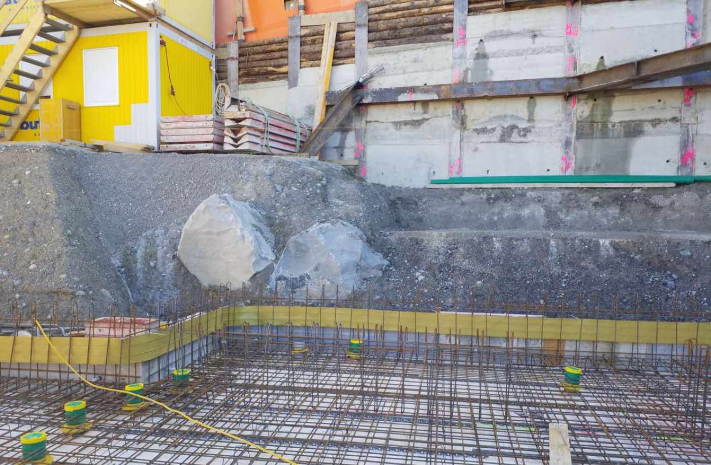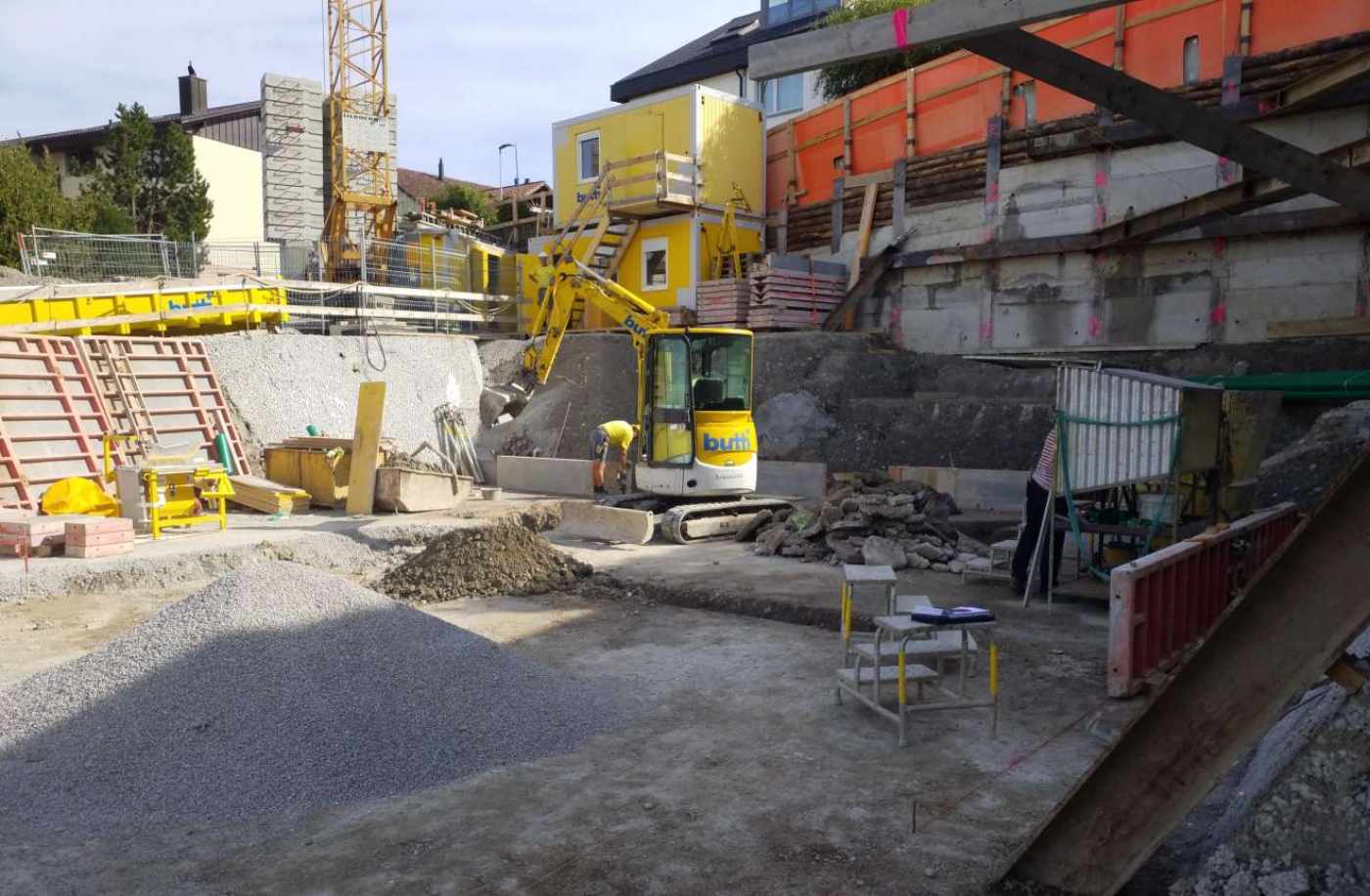 Eine gespriesste Rühlwand umschliesst die Baugrube zweiseitig. Das Gebäude wird flach fundiert.