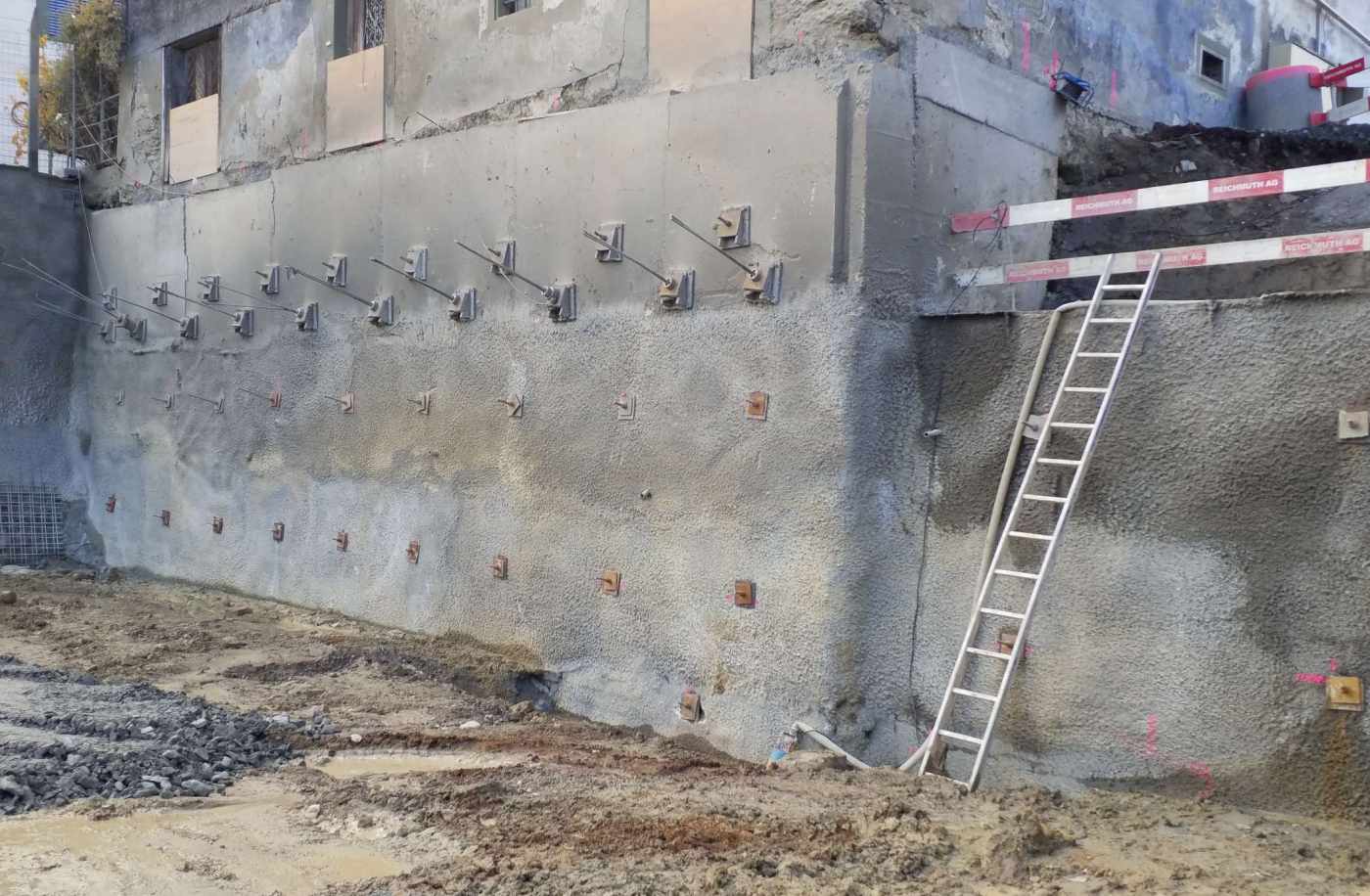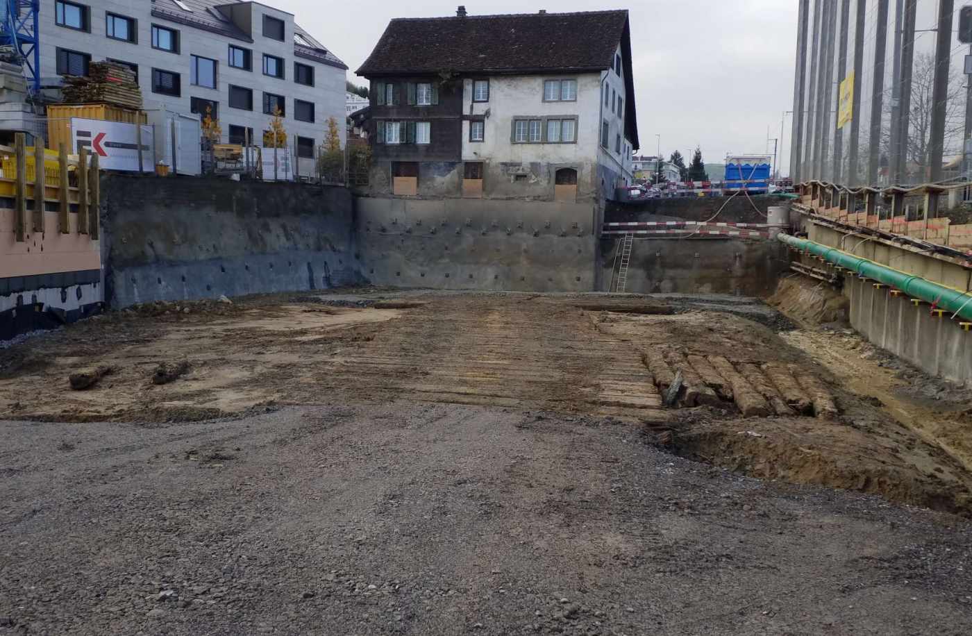 Baugrube: Entlang der SOB-Bahnlinie musste ein Schutzgerüst erstellt werden. Zwecks Projektoptimierung wurde das Schutzgerüst mit dem Baugrubenabschluss kombiniert, sodass entlang der Bahnlinie eine rückverankerten Rühlwand erstellt wurde. Um das Projekt zu realisieren, mussten im Zusammenhang mit den Baugrubenarbeiten diverse Werkleitungen mittels Konsolen an die Rühlwandträger um verlegt werden. Weiter galt es, das angrenzende, denkmalgeschützte Haus mittels einer Unterfangung zu sichern.