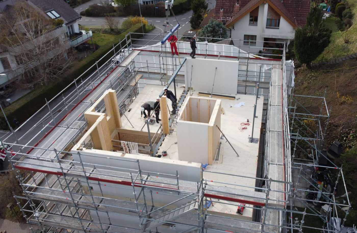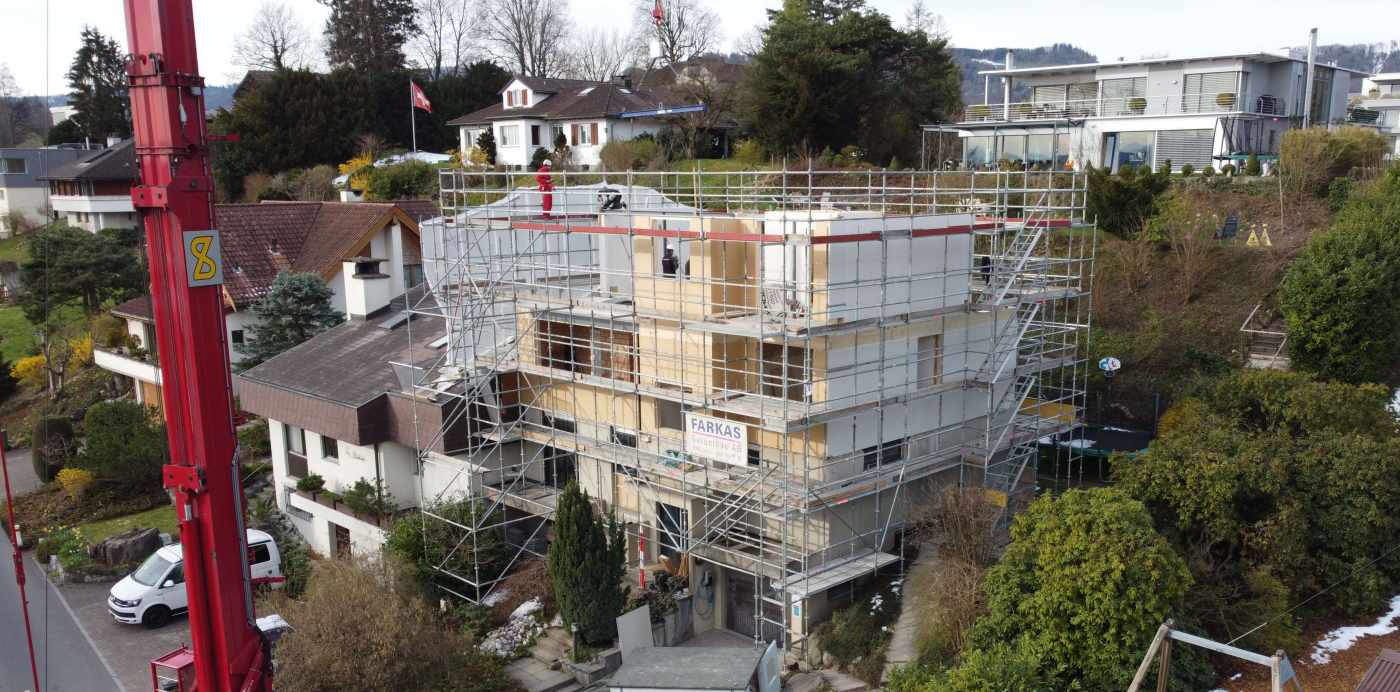 Das bestehende Dach wurde abgebrochen und die schrägen Wände neu ergänzt. Die neue Decke wurde in Holzbauweise realisiert und ist für den sorgfältigen Lastabtrag auf die bestehende Bausubstanz zuständig. Darüber wurde das Dachgeschoss komplett in Holzbauweise errichtet. Um die Lasten der Aufstockung abtragen zu können, wurden lokal die Geschosse darunter und die Fundation verstärkt. Aufgrund der schwachen, bestehenden Betondecken in den unteren Geschossen, durften die meisten Wände keine Mehrbelastung erfahren. Zweischalenmauerwerke, schwache Decken und grosse Fenster verlangten vom neuen Holzbau sorgfältig entwickelte Anschlüsse und Details.