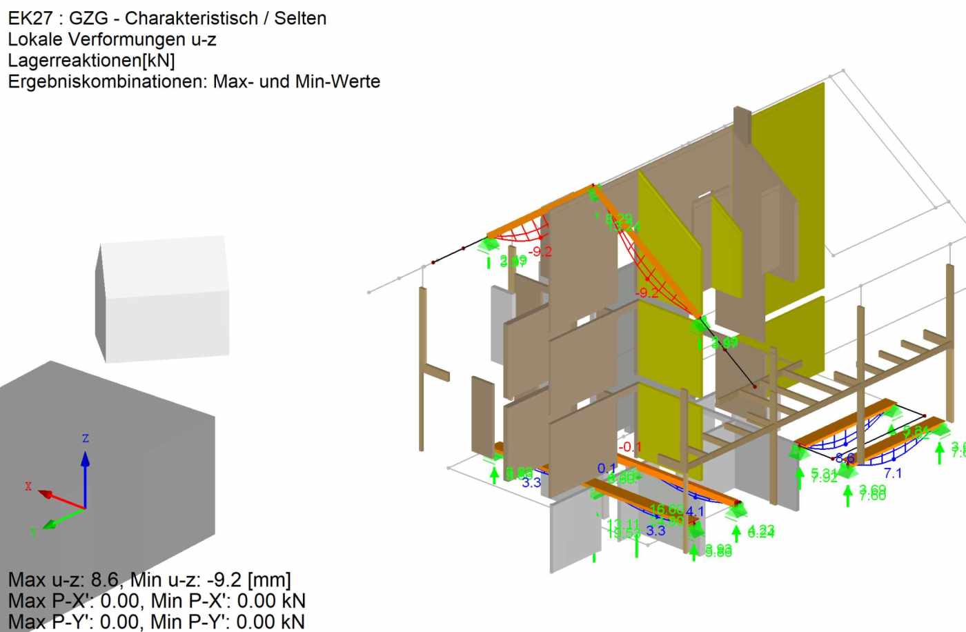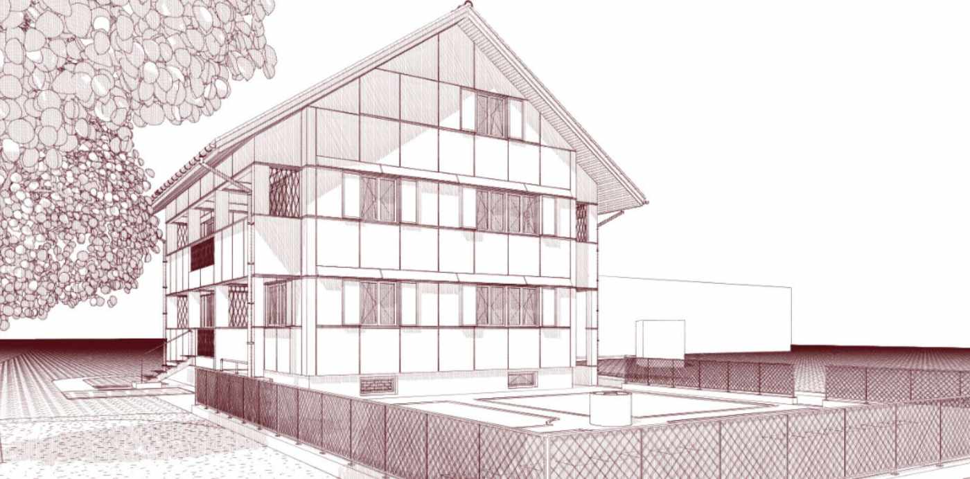 Das ursprüngliche Wohngebäude wird durch einen Ersatzneubau neu erstellt. Das Untergeschoss ragt einen Meter aus dem Boden und wird in Sichtbeton erstellt. Die Decke "UG" wird dann bereits in Holzbauweise realisiert. Die oberen Geschosse, welche insgesamt 2 Wohnungen aufweisen werden in Holzbauweise errichtet. Die leichte Tragstruktur ergänzt sich mit dem massiven Wände im UG und der Bodenplatte optimal und sorgen für einen regelmässigen Lastabtrag in den Untergrund. Aufgrund dessen kann trotz eines "mässigen" Bodens eine aufwendige und kostentreibende Pfahlfundation vermeiden werden. Aufgrund des frühen Mitwirkens in des Ingenieur konnte so ein optimales Tragwerk gefunden werden. So wurden auch anspruchsvolle Details in frühen Projektphasen aufgegriffen und spezifisch geplant.