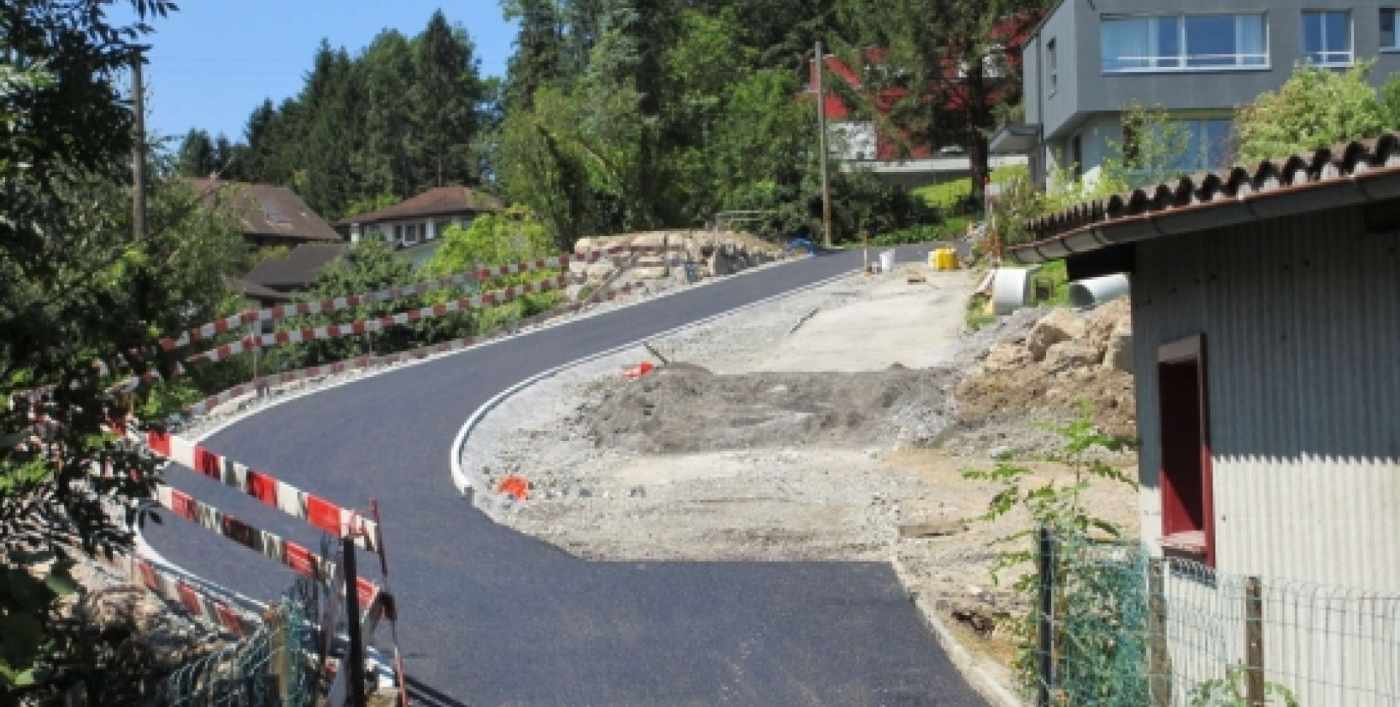 Die bestehende Zufahrt musste in Folge eines Neubaus verlegt werden. Die Bauarbeiten beinhalteten die Realisierung einer Natursteinstützmauer, diverse Werkleitungs- und Siedlungsentwässerungarbeiten sowie die Erstellung des Strassenkörpers.