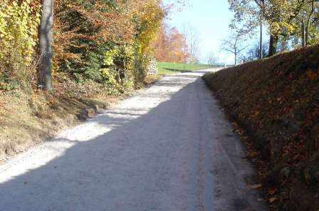 Der Rigiweg in Greppen ist eine Erschliessungsstrasse zu einzelnen Bauernhöfen und Gebäuden. Statt einer konventionellen Oberbausanierung wurde aus Kostengründen, Verkehrsbehinderungen, Bauzeit und Vollsperrungszeiten eine Sanierung mit Zementstabilisierung gewählt. Innert 1 ½ Tagen wurden die obersten 30 cm (inkl. Belag) der ca. 1700 m2 gefräst und unter Wasserbeigabe mit Zement gemischt. Anschliessend wurde in zwei weiteren Tagen die Feinplanie erstellt und ein einschichtiger Belag eingebaut.