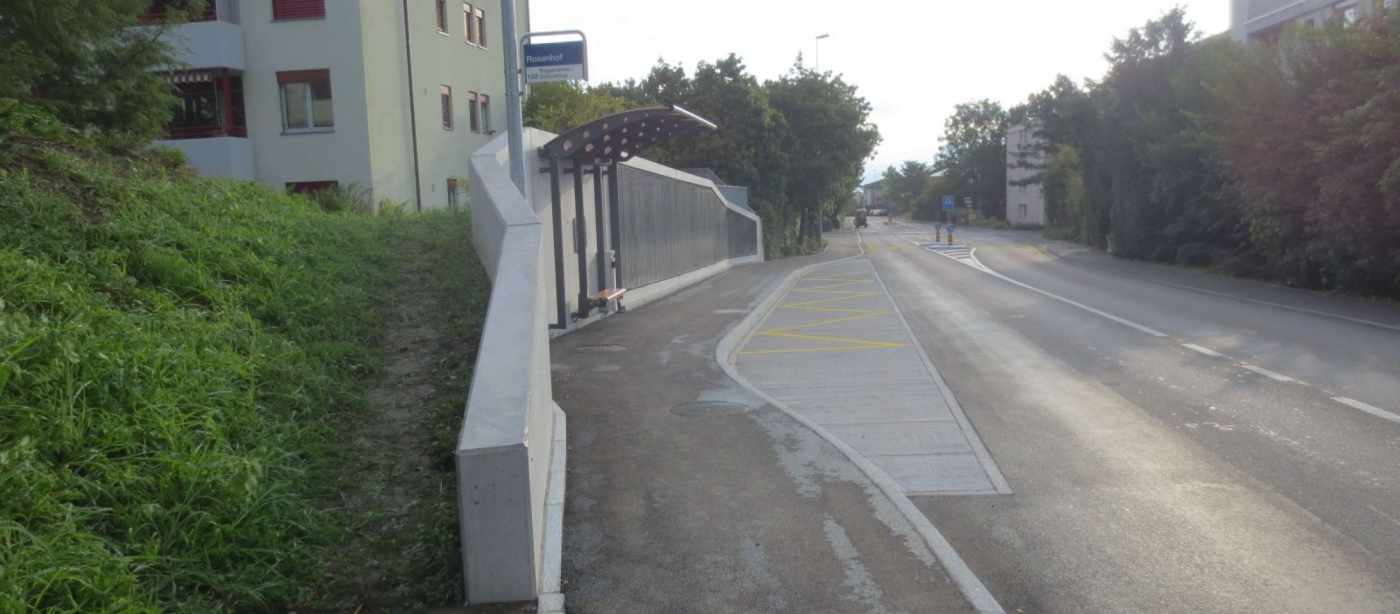 Es ist ein Anliegen der Gemeinde Freienbach und des Kantons Schwyz, auf den Hauptverkehrsachsen optimalere Haltestellensituationen mit Busbuchten zu schaffen. Mit einer Busbucht im Bereich der Fahrbahnhaltestelle Rosenhof in Fahrtrichtung Schindellegi konnte dem Ziel, Optimierung des Verkehrsablaufs und Verbesserung der Verkehrssicherheit, Rechnung getragen werden. Für die Busbenutzer wurde ein gedeckter Personenunterstand und entlang der Busbucht eine Lärmschutzwand erstellt. Das Trottoir und die bestehende Fussgängerschutzmittelinsel wurden neu angeordnet und die Inselköpfe auf 2 m verbreitert.